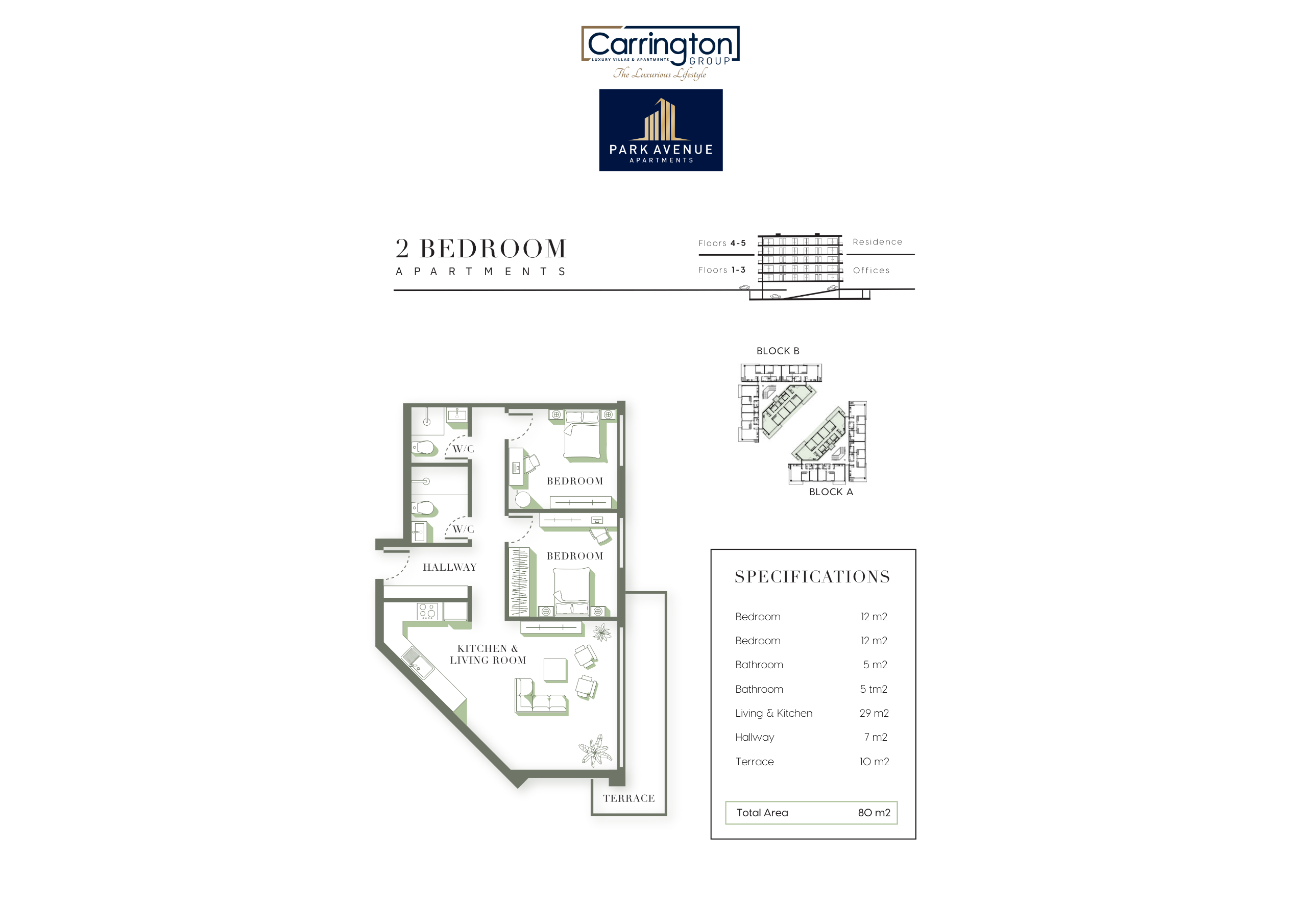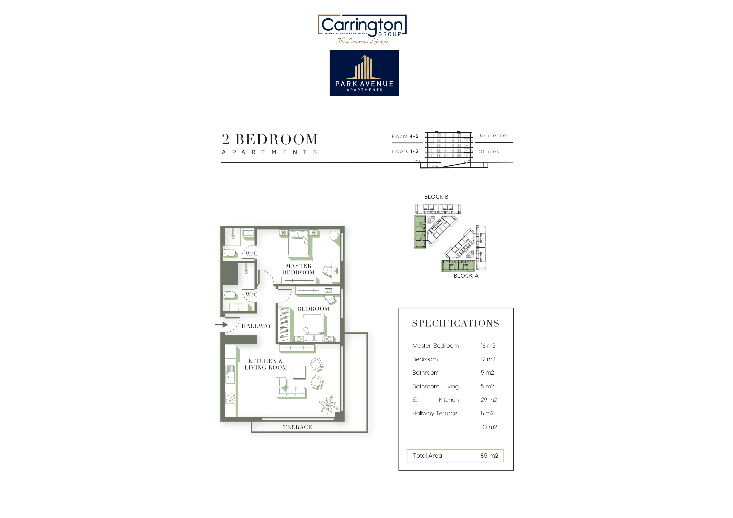 Park Avenue consists of 2 blocks with 5 floors and elevator access. The first three floors are dedicated to 36 commercial and office units, while the 4th and 5th floors include 24 residential apartments.
